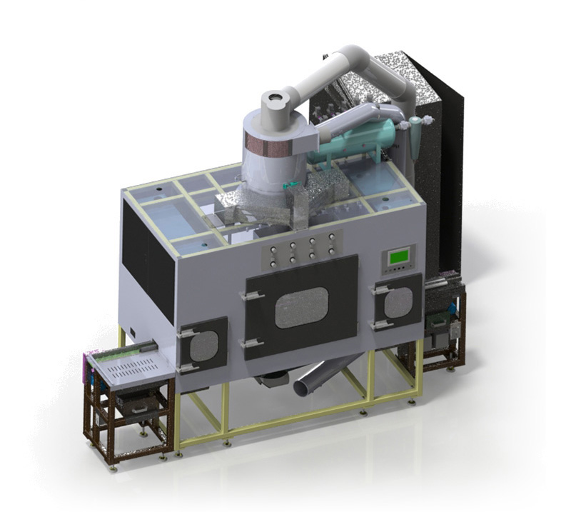 擊落的廢棄噴涂粉塵和玻璃砂通過腔室內旋風分離裝置和除塵設備自動除塵、分離并再次清洗芯子;比傳統滾筒式的方式要溫柔,并有效的保護噴涂層不被撞擊設備采用人工上料,下料上到單獨的收料盤,也可根據客戶需求定制收料方式