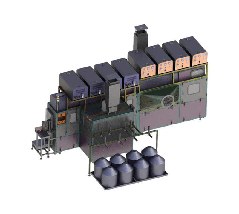 適用于金屬化薄膜電容器芯子的噴金,噴鋅或噴鋅錫合金、鋅鋁合金皆可。來料為人工堆疊好的噴金治具,手動放到上料平臺,自動掛鉤,出料和上料在同一位置,人工拿取,減少了人員的走動提高效率,噴金采用4+4的方式,噴金絲的材料利用率比其它種類的噴金機高10%以上。